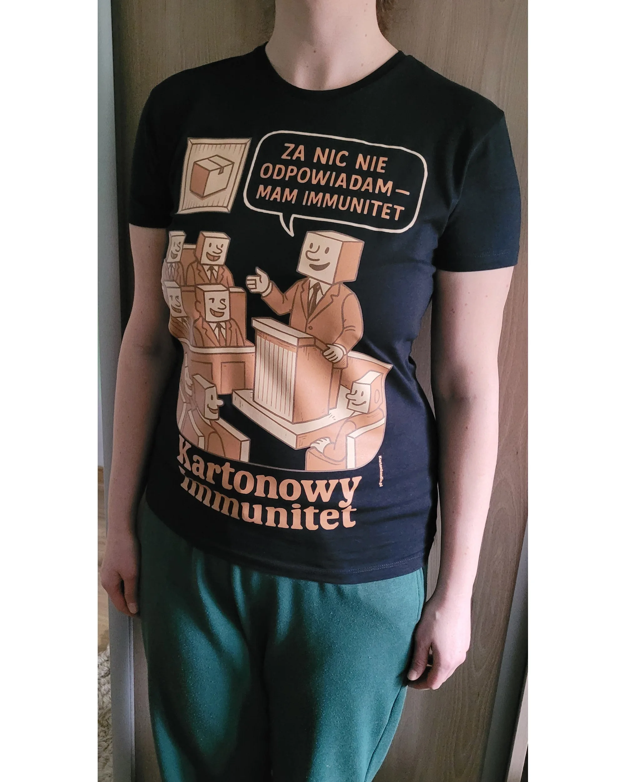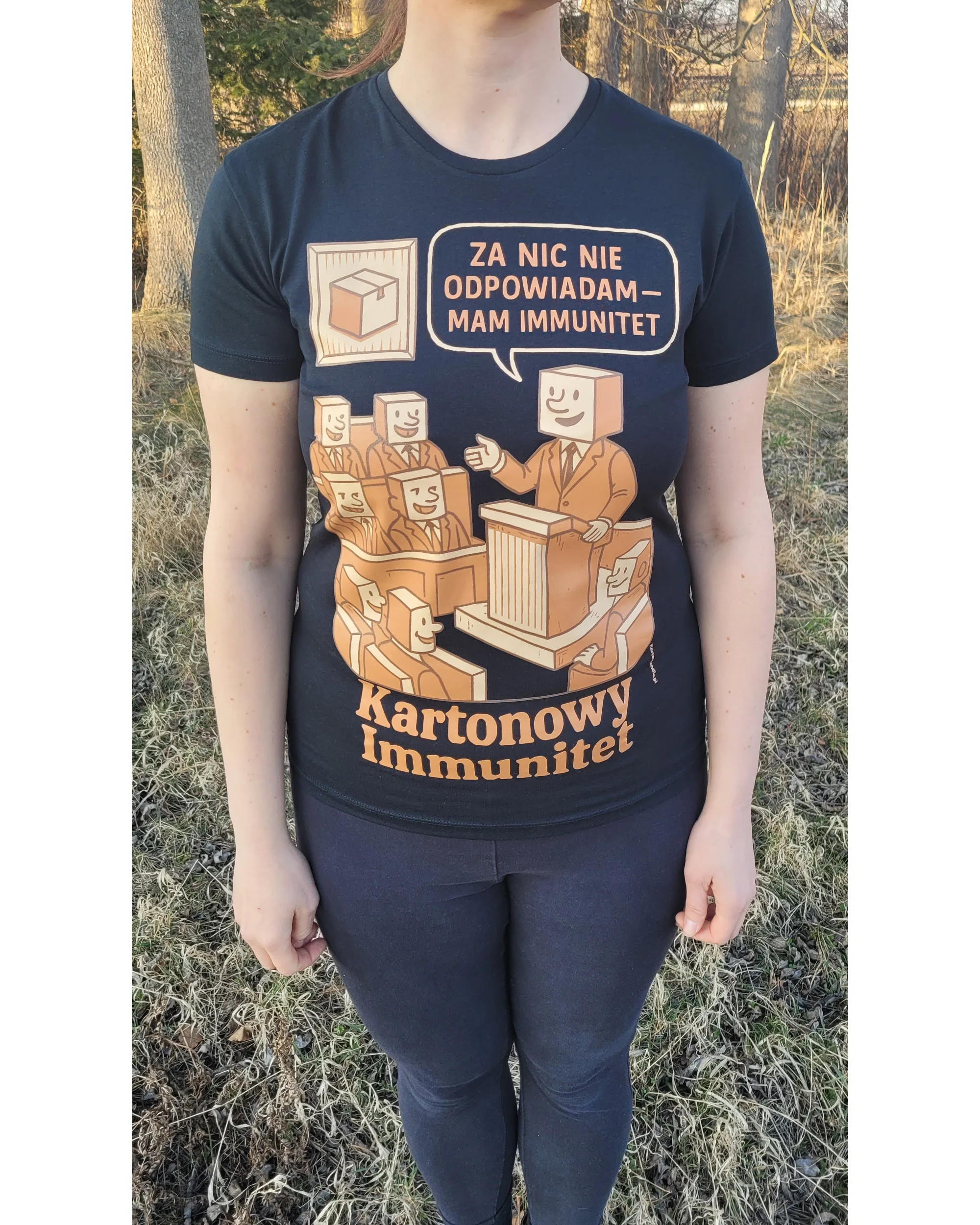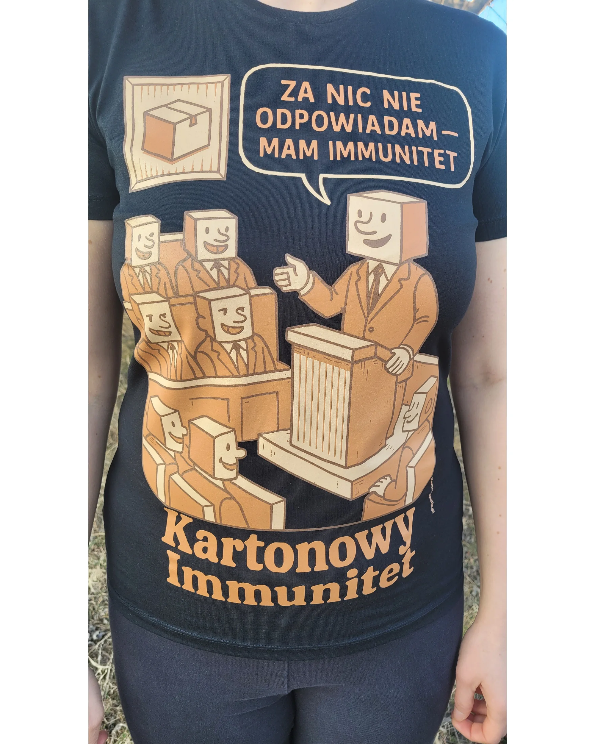 To ironiczny komentarz do sytuacji, w których władza, pozycja albo układ potrafią dawać poczucie bezkarności, a zwykły człowiek może co najwyżej patrzeć na to z boku. „Kartonowy Immunitet” to satyra do noszenia — wyrazista, czytelna i od razu mówiąca, o co chodzi.