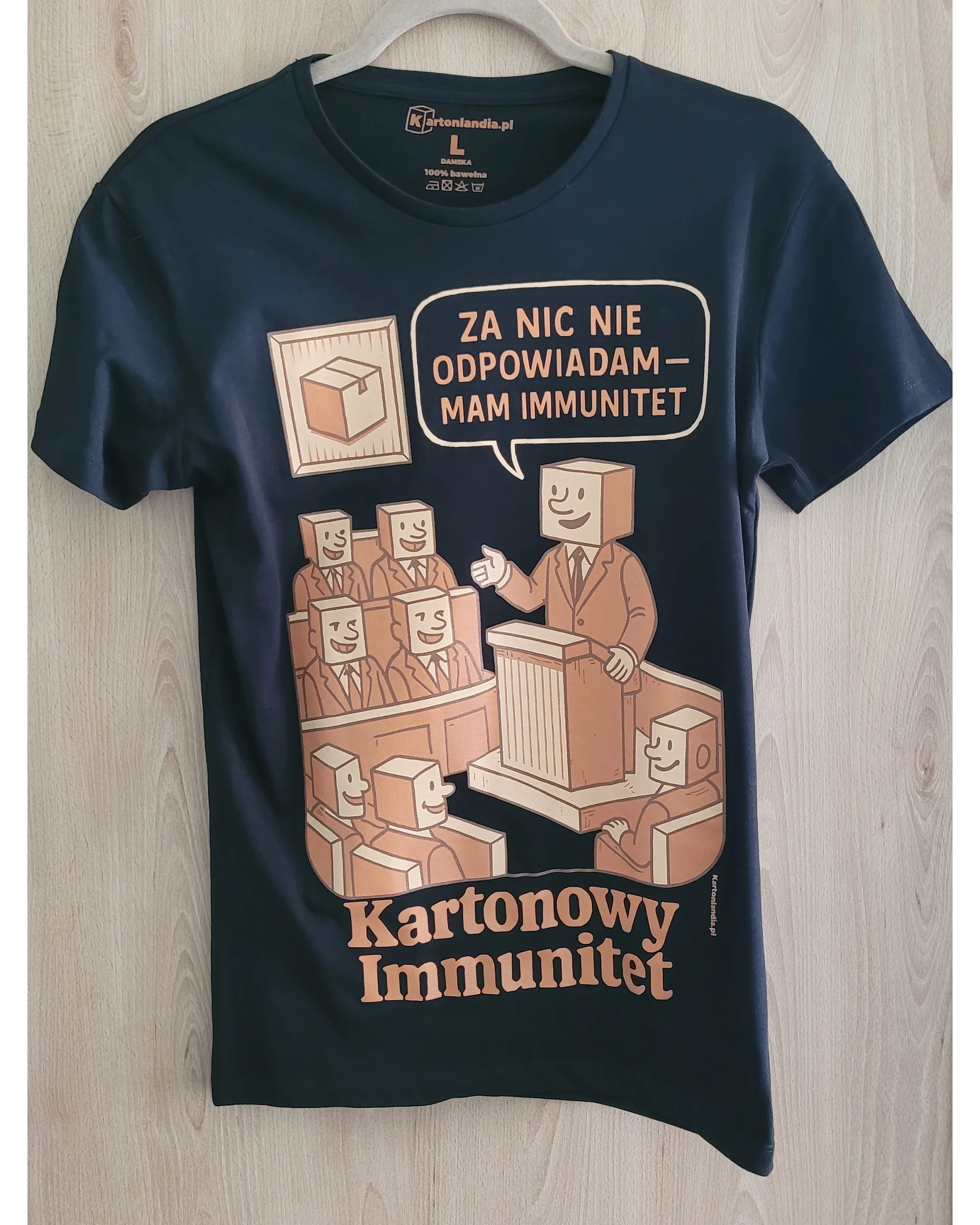 Bawełniana koszulka damska 170 g/m² o lekko taliowanym kroju z autorskim nadrukiem Kartonlandii „Kartonowy Immunitet”. Satyryczny motyw o bezkarności, układach i odpowiedzialności, która znika szybciej niż obietnice.