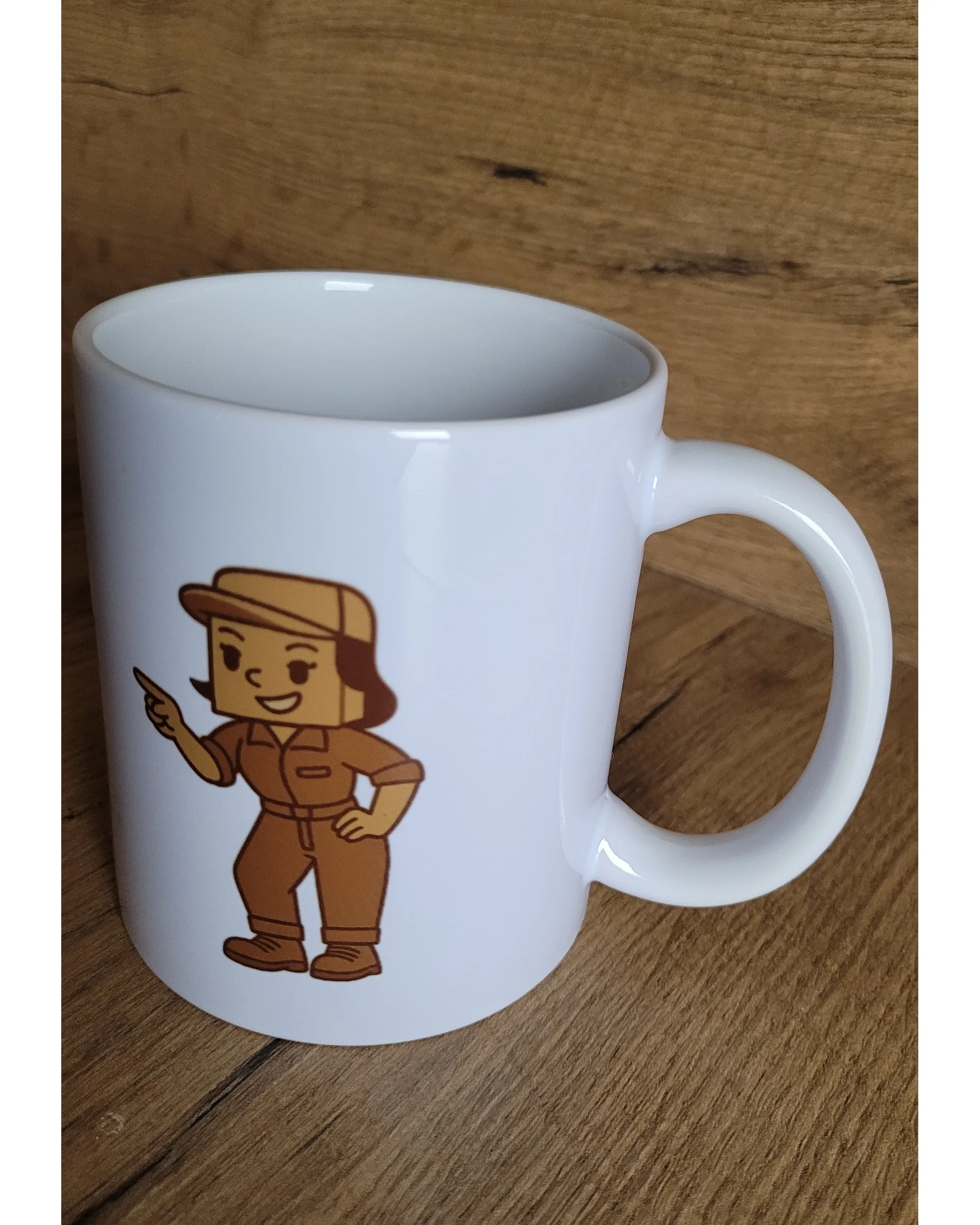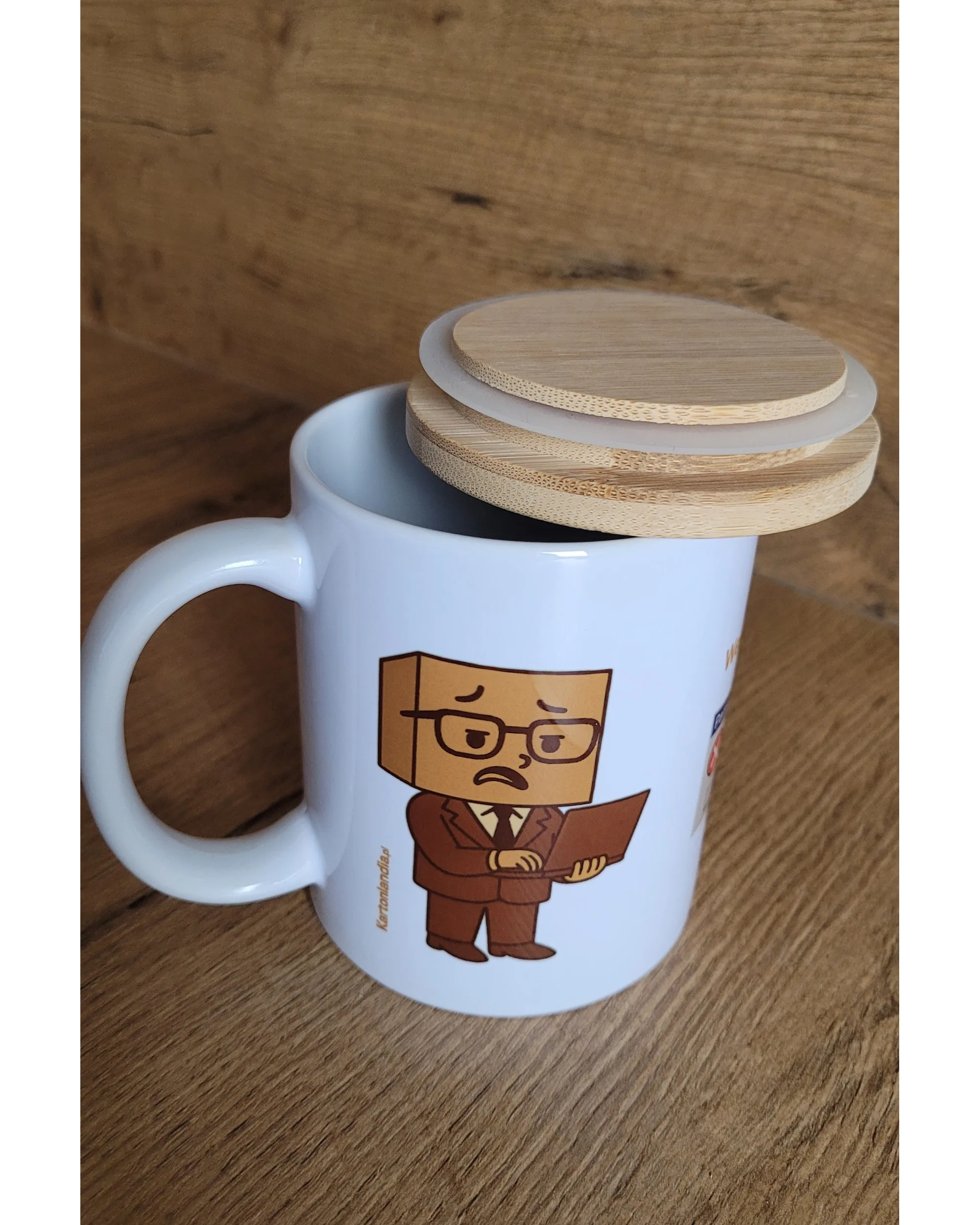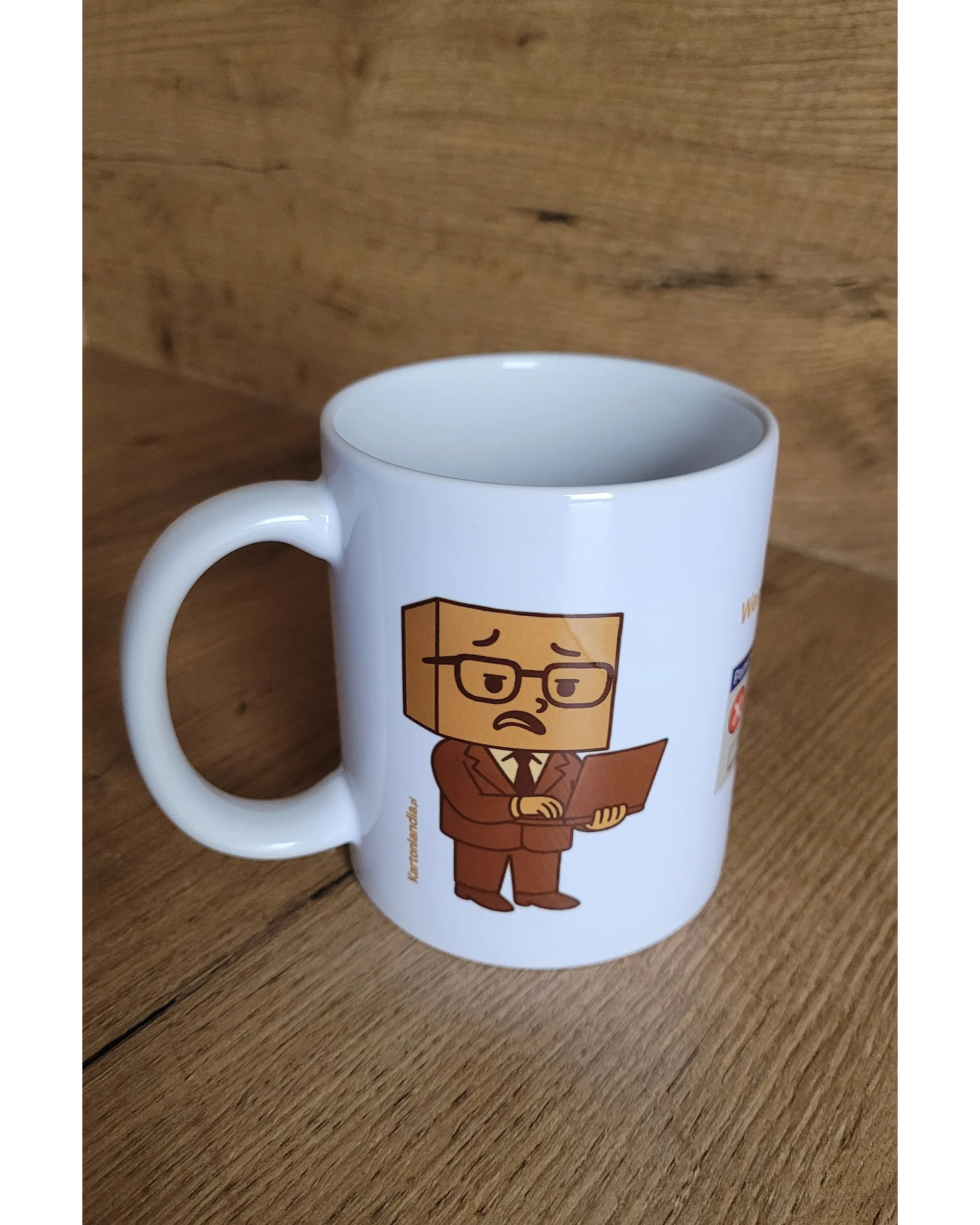 Biały kubek ceramiczny o pojemności 330 ml z nadrukiem „Kartonlandia. Wersja beta od 1989 r.” oraz satyryczną grafiką inspirowaną kartonową rzeczywistością.