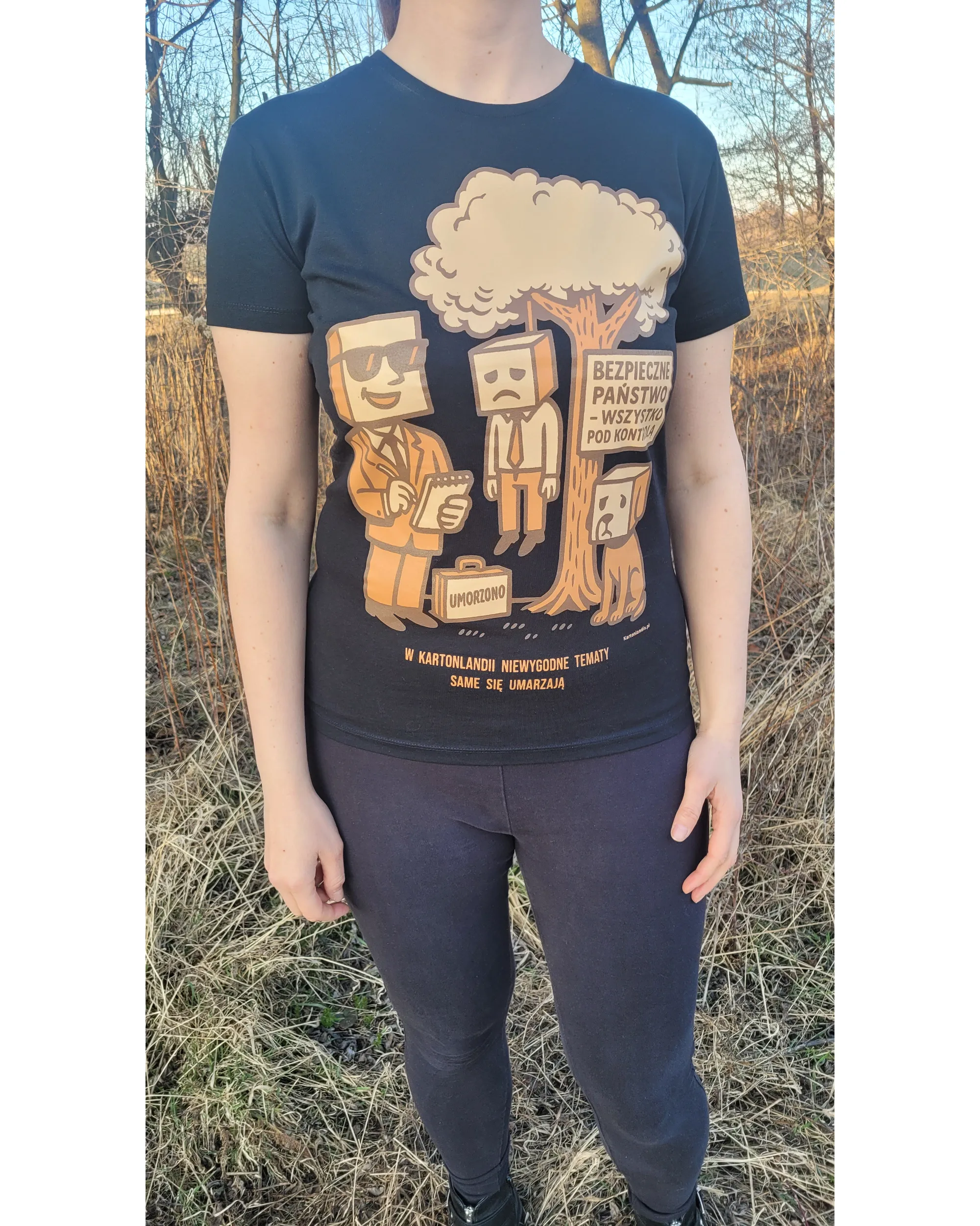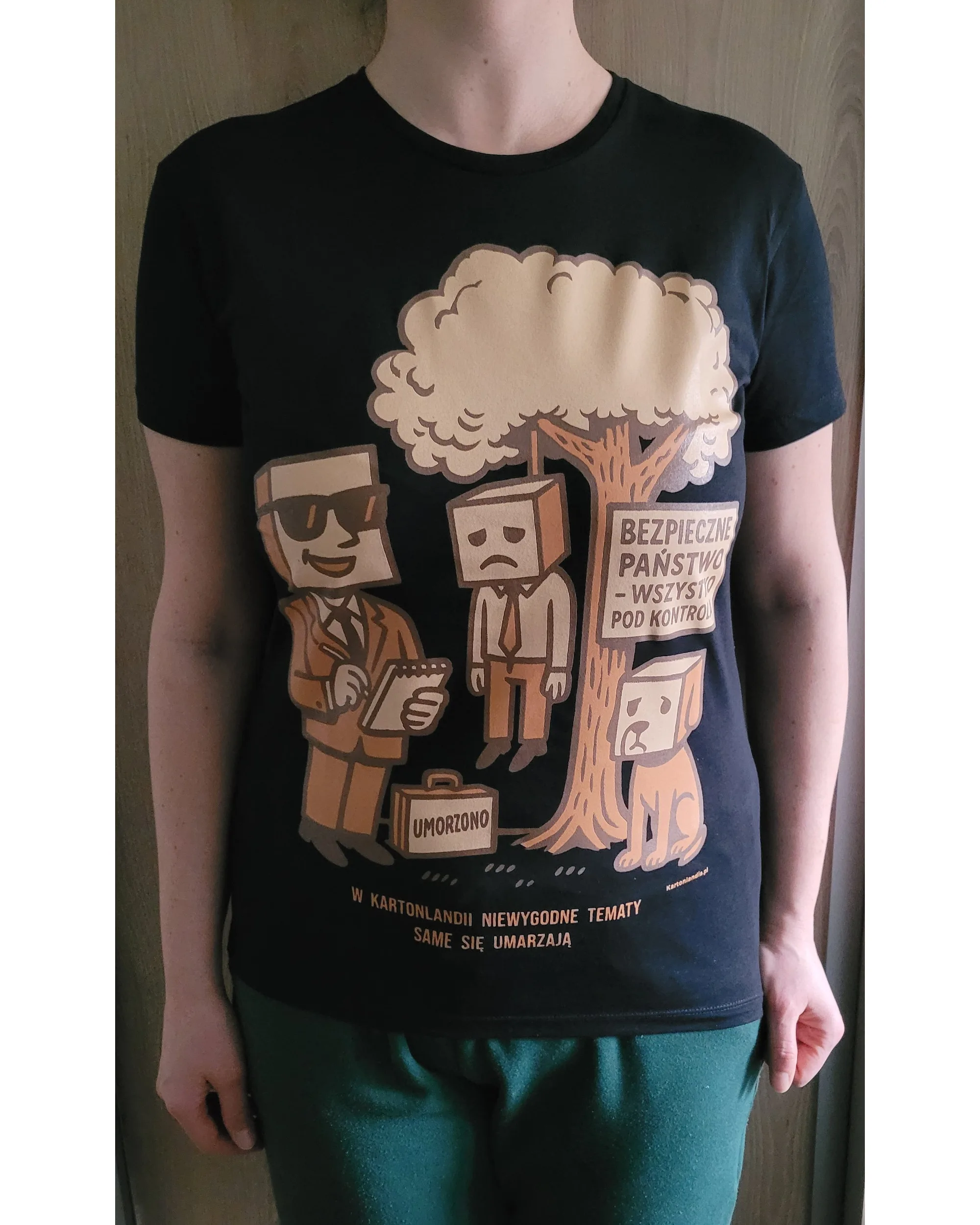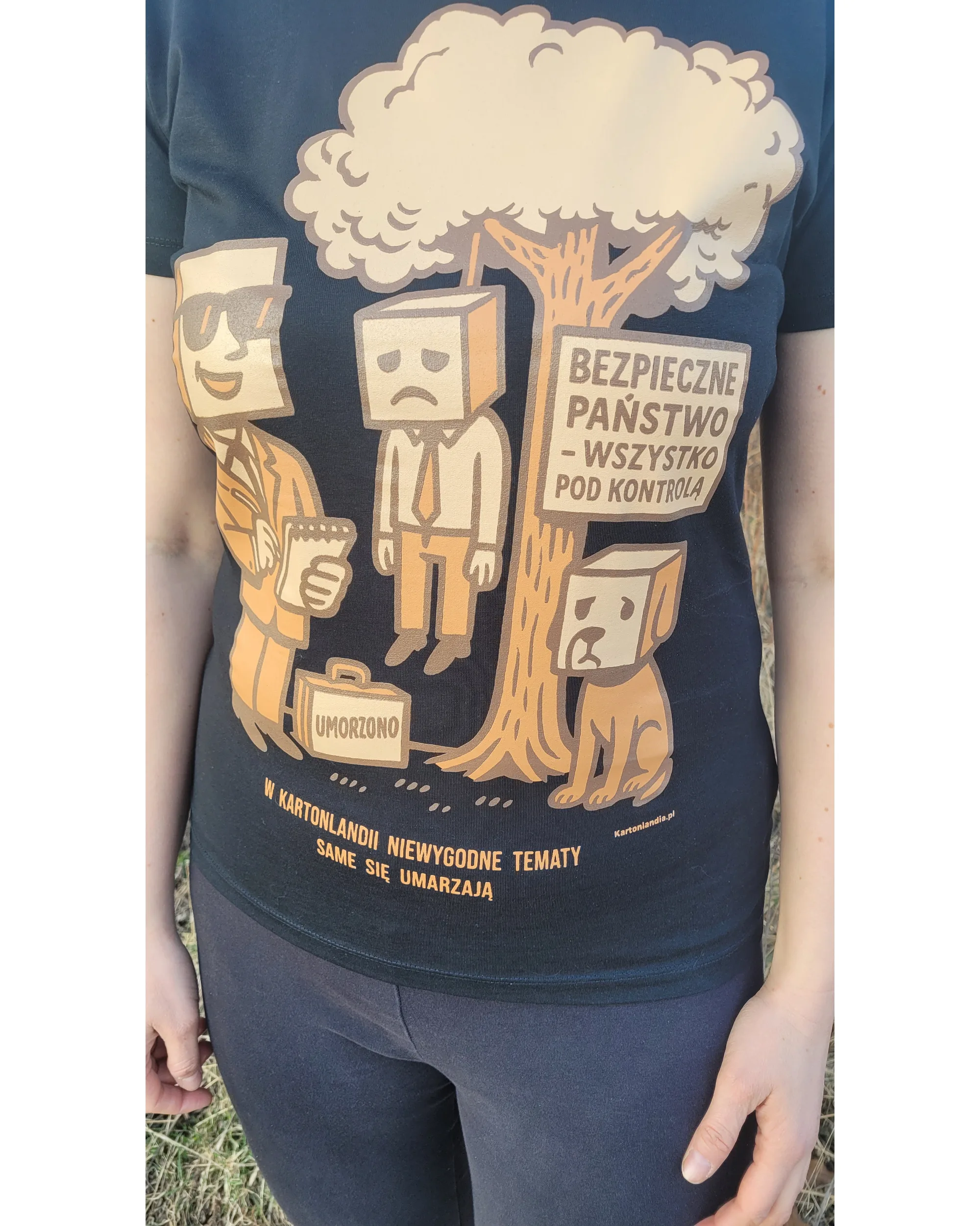 Na nadruku widać uśmiechniętego kartonowego urzędnika, walizkę z napisem „Umorzono”, tablicę „Bezpieczne państwo – wszystko pod kontrolą”, smutną postać zwisającą z drzewa i psa siedzącego pod nim. Całość domyka hasło: „W Kartonlandii niewygodne tematy same się umarzają”.